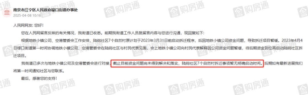 根据地铁小镇公司、空港管委会工作安排,陆纲社区7个自然村原计划于2023年3月31日前启动拆迁程序,后因地铁小镇公司资金问题,导致拆迁项目暂缓。2023年4月4日禄口街道第一时间协调地铁小镇公司、空港管委会在陆纲社区与村民代表见面,会上地铁小镇公司向村民代表解释因公司资金问题暂缓,待后期资金到位再启动陆纲社区拆迁项目。